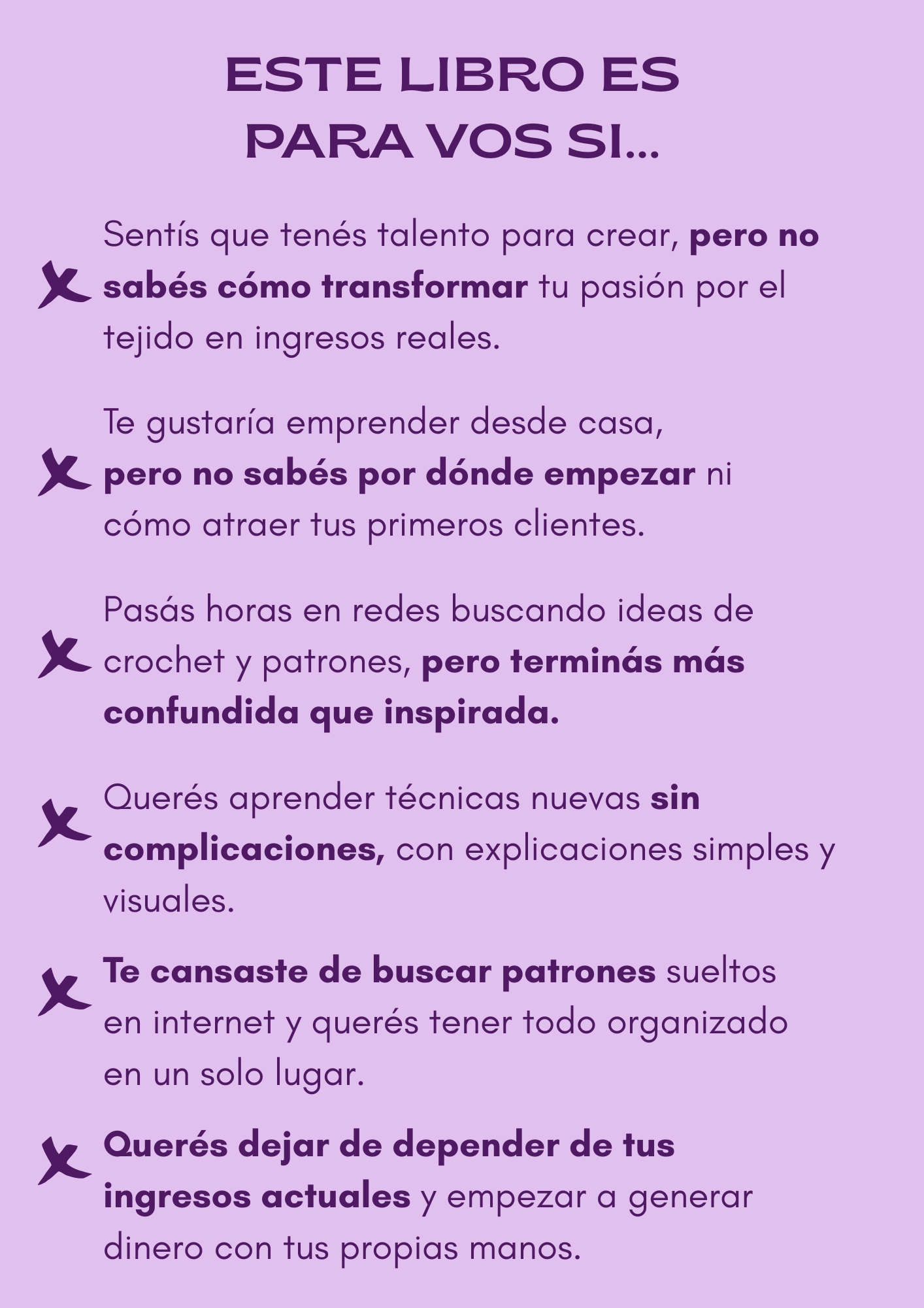 “Ya tengo varios libros de crochet, pero este es diferente: enseña, inspira y motiva a emprender. Lo abrí y no pude parar de leer, gracias por tanto material!.”