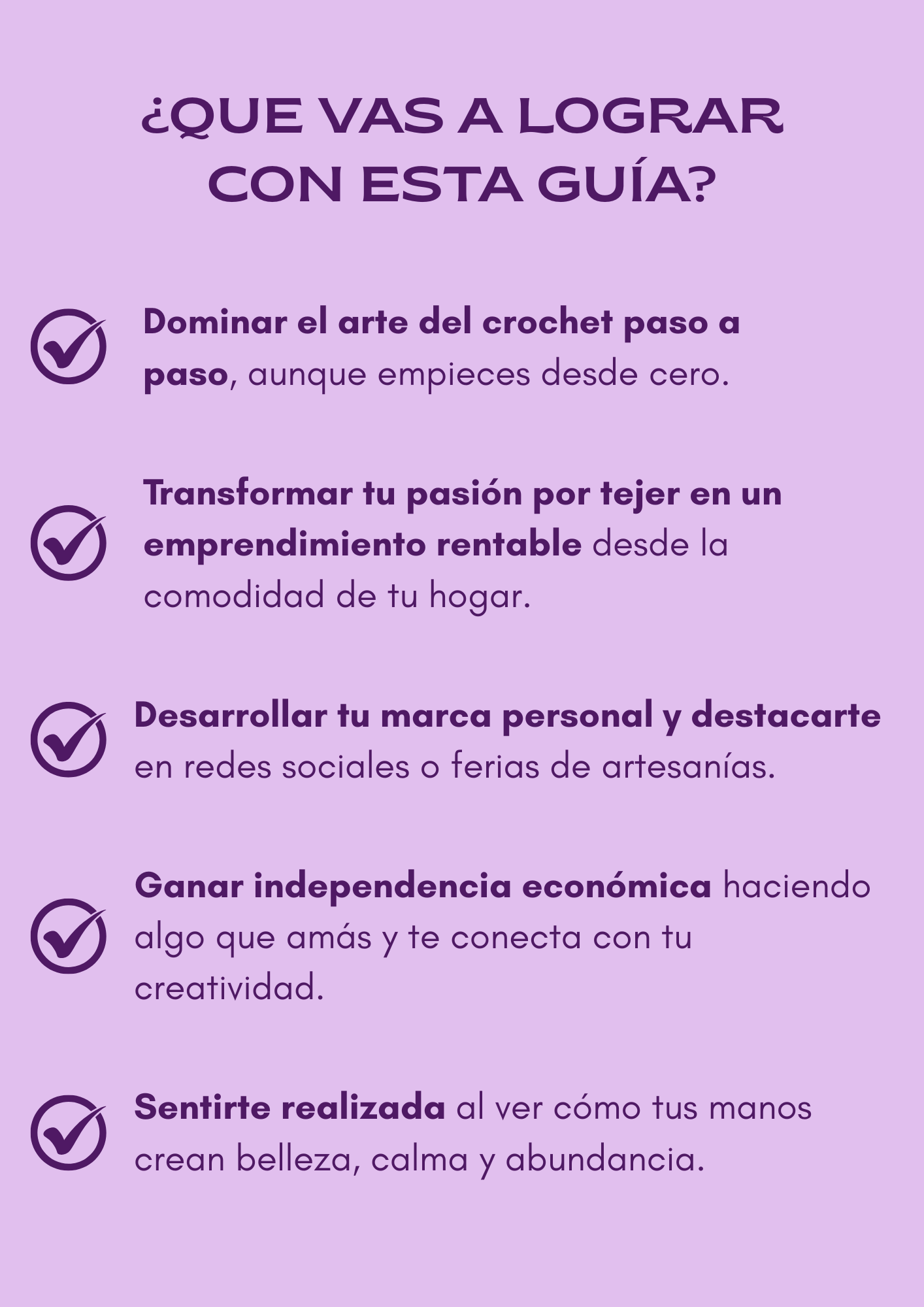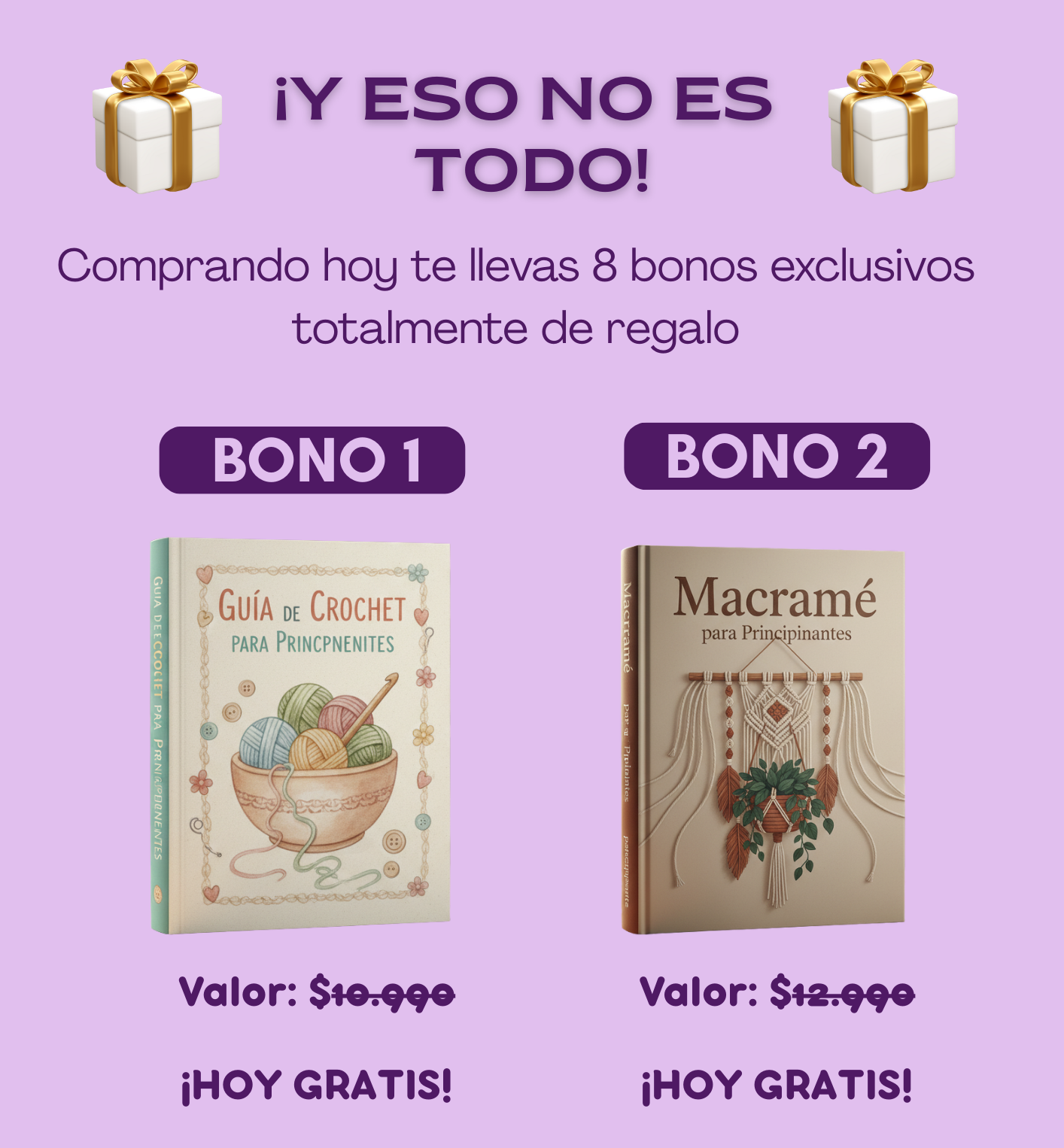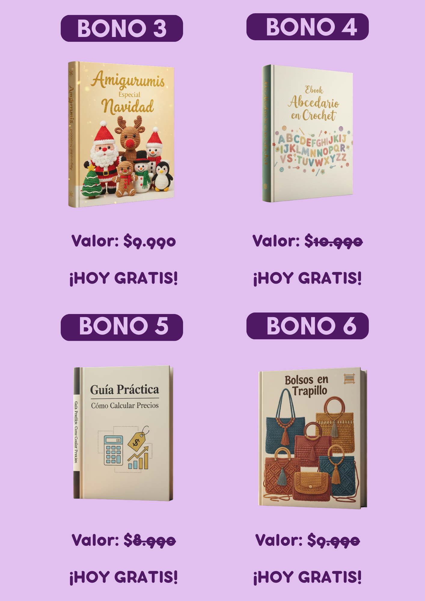 Incluye más de 8.000 patrones de crochet, ideas para vender tus tejidos y 8 bonos exclusivos que te ayudarán a potenciar tu emprendimiento.